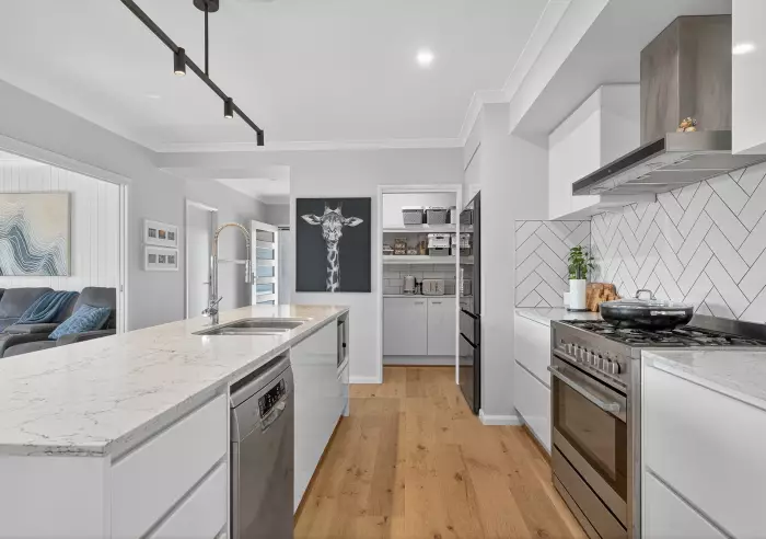 Step inside and you’ll find a thoughtfully designed floorplan offering four bedrooms plus a study, three separate living spaces, and a master suite with an oversized walk-in robe and private ensuite with double vanities. The galley-style kitchen is the heart of the home, complete with stone benchtops, Bosch appliances, 900mm gas cooktop and oven, a butler’s pantry with sink, and space for your plumbed fridge.