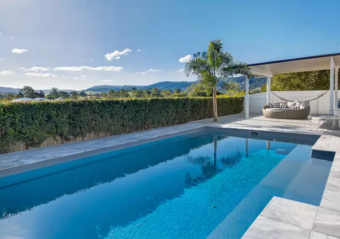 Outdoor entertaining is a dream, with an extra large alfresco area featuring built-in speakers, a 4m electric sun blind, and a heated 8m pool with spa jets and lighting – the perfect spot to relax with family and friends while soaking in the mountain backdrop.