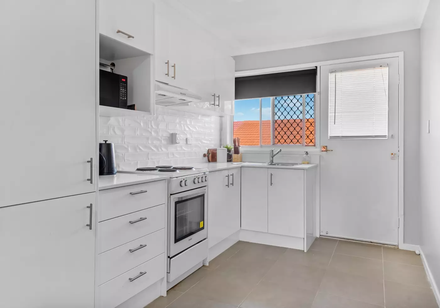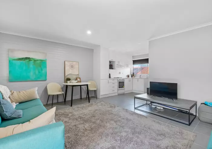 The unit features two generous bedrooms, both with built-in wardrobes, providing plenty of storage and natural light. The modern bathroom is sleek and functional, designed and cleverly includes a space for your washing machine. An open-plan living and dining area creates a welcoming space for relaxing or entertaining, seamlessly flowing into the updated kitchen, which offers ample bench space and cupboards.