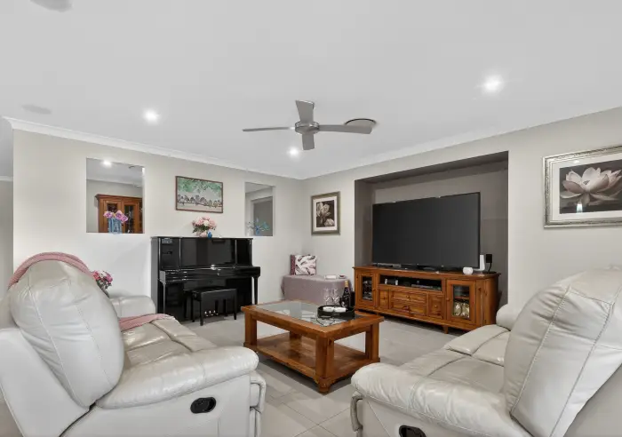 The home features four well-proportioned bedrooms, including a spacious master suite that comfortably accommodates a king-size bed, complete with a walk-in robe and a large ensuite featuring double vanities. Three additional bedrooms include built-in robes, while a dedicated study or computer nook provides a practical work-from-home or homework solution.